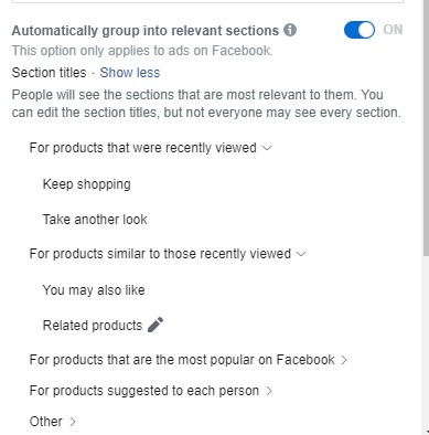 Mai jos, poți crea diferite secțiuni în collection, iar Facebook te ajută cu ceva recomandări. Vei putea să introduci chiar o secțiune de reduceri, dacă ai o campanie de reduceri activă pe site.